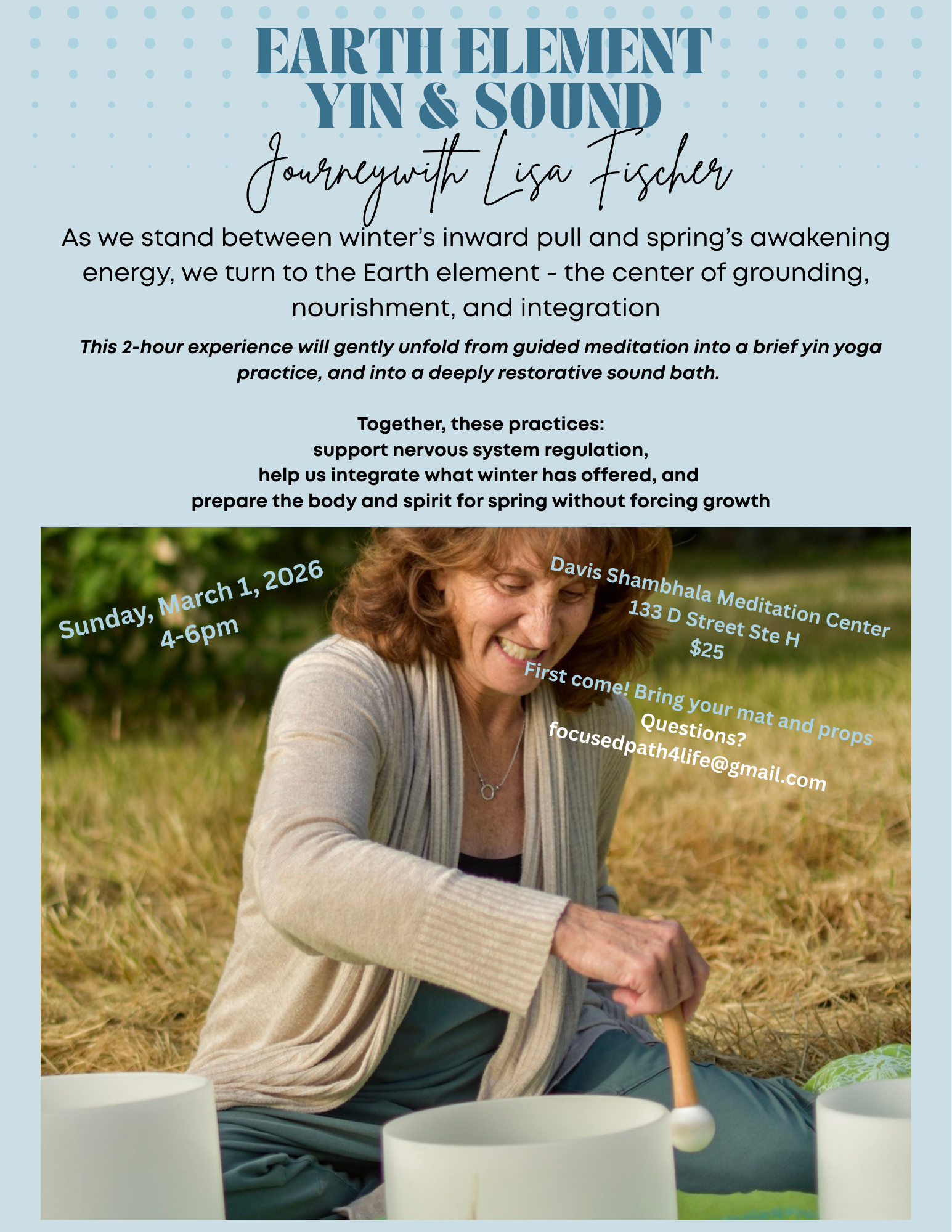 Upcoming Events Past Events Featured Dec 21 Dec 21, 2025 Solstice Sound Bath Dec 21, 2025 Dec 21, 2025 Jun 20 Jun 20, 2025 Summer Solstice Sound Bath Jun 20, 2025 Jun 20, 2025 May 20 May 20, 2020 Quarantine Reset - A Journey Workshop and Virtual Mini Retreat May 20, 2020 May 20, 2020 Dec 21 Dec 21, 2019 Winter Solstice Candlelight Yoga+Sound Bath Retreat (Copy) Dec 21, 2019 Dec 21, 2019 Sep 21 Sep 21, 2019 Yin Yoga + Sound Bath Retreat Sep 21, 2019 Sep 21, 2019 Aug 25 Aug 25, 2019 Yin Yoga Workshop Aug 25, 2019 Aug 25, 2019 Jan 12 Jan 12, 2019 Retreat for Yourself 2019 Jan 12, 2019 Jan 12, 2019 Nov 21 Nov 21, 2018 Coffee Chat with Lisa Fischer Nov 21, 2018 Nov 21, 2018 Nov 13 Nov 13, 2018 – Nov 21, 2018 Coffee Chat with Lisa Fischer Nov 13, 2018 – Nov 21, 2018 Nov 13, 2018 – Nov 21, 2018 Nov 7 Nov 7, 2018 – Nov 21, 2018 Coffee Chat with Lisa Fischer Nov 7, 2018 – Nov 21, 2018 Nov 7, 2018 – Nov 21, 2018 Oct 10 Oct 10, 2018 Rethinking Your Thinking - Sacramento Oct 10, 2018 Oct 10, 2018 Oct 2 Oct 2, 2018 Rethinking Your Thinking - Davis Oct 2, 2018 Oct 2, 2018 Jun 14 Jun 14, 2018 Rethinking Your Thinking Jun 14, 2018 Jun 14, 2018 Apr 28 Apr 28, 2018 Rethinking Your Thinking Apr 28, 2018 Apr 28, 2018